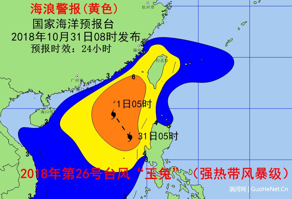 国家海洋预报台今天(31日)早上继续发布海浪黄色警报。今年第26号台风“玉兔”(强热带风暴级)昨天穿过菲律宾后进入我国南海海面,今天5时正位于东沙岛南偏东方向约410公里的南海东部海面上。预计,“玉兔”将逐渐开始向北移动,强度维持或略有增强,11月2日非常接近广东东部沿海,随后转向台湾海峡方向移去,将在南海北部海面减弱消失。