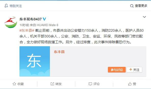 据东丰县互联网信息中心最新消息,截止目前,当地共出动公安警力150余人,消防220余人,医护人员80余人,机关干部300余人,公安、消防、卫生、安监、环保、民政等部门密切配合,全力做好现场救援工作。另外,经过排查,此次事件排除暴恐行为。