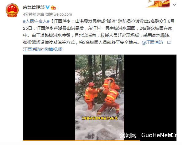 6月25日,江西萍乡芦溪县山洪暴发,东江村一民房被洪水围困,2名群众被困在家中。由于道路被洪水冲毁,且水流湍急,救援人员赶赴现场后,采用高地绳降、抛投器架设横渡系统等方式,将2名被困人员转移至安全地带。