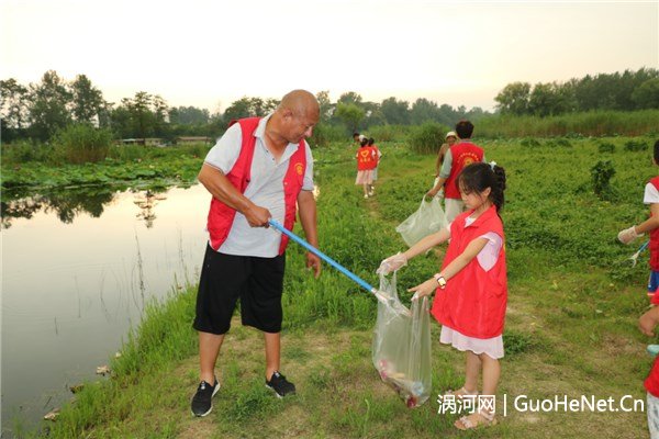 义门镇涡河岸边湿地公园,志愿者的红色马甲与蓝色天空、绿色草地、美丽荷花构成了一道亮丽的风景线。他们大手拉小手,戴上手套,手持垃圾夹、垃圾袋,以地毯式“寻宝”的方式清理沿河垃圾。烟头、塑料袋、食品外包装、饮料瓶等尽收囊中。