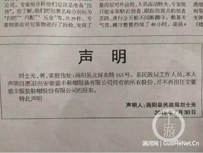 涡阳县纪委监委要求公职人员不能经商办企业。此前,就发现了刘士光参股,要求他退股;今年5月,发现他还没退后勒令他立刻退股,否则按纪律处分,他这才去报纸上刊登了声明。