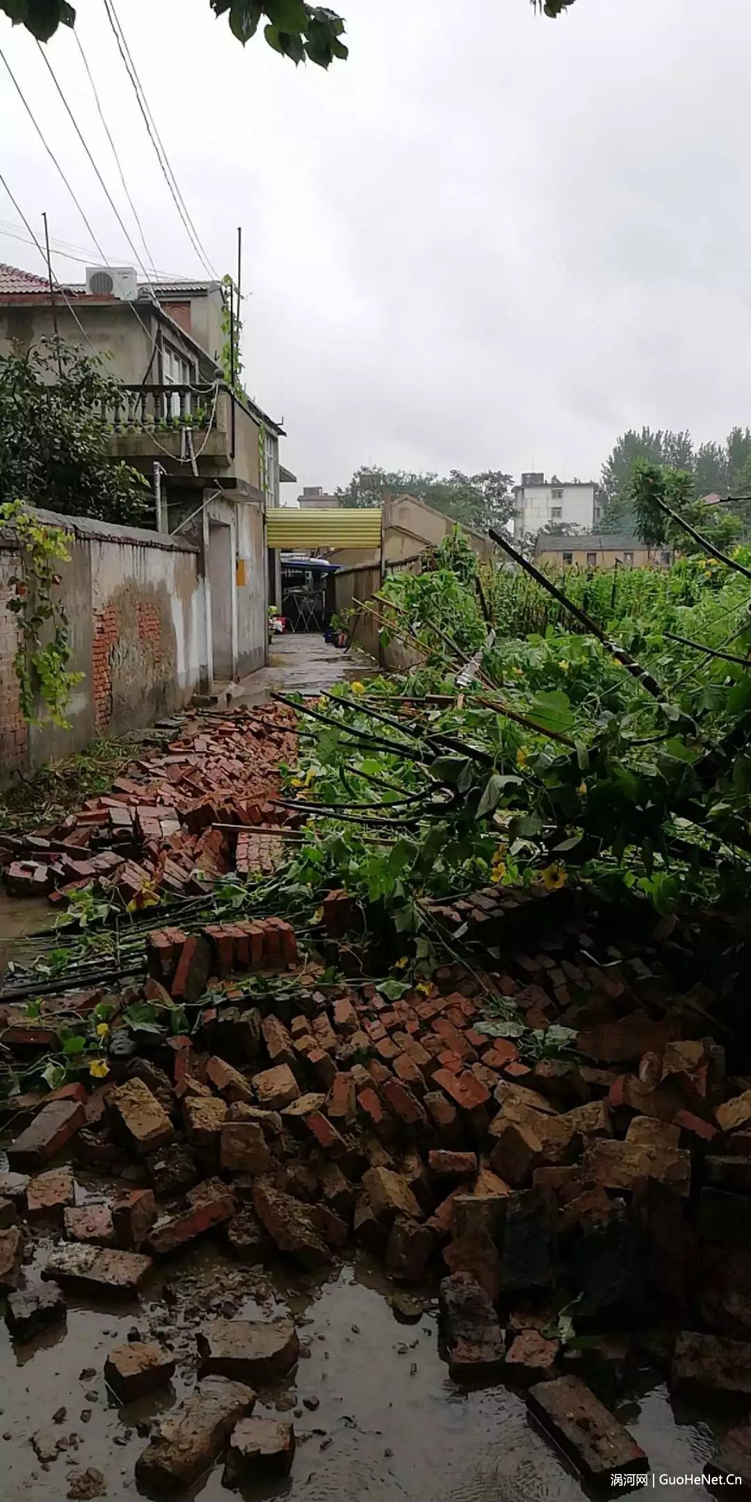 风吹墙倒:家住在官路口杨庄的市民尹先生反应:今早刚打开自家大门吓了一跳。幸好没人从这里经过,砸住人,后果会是很严重的!