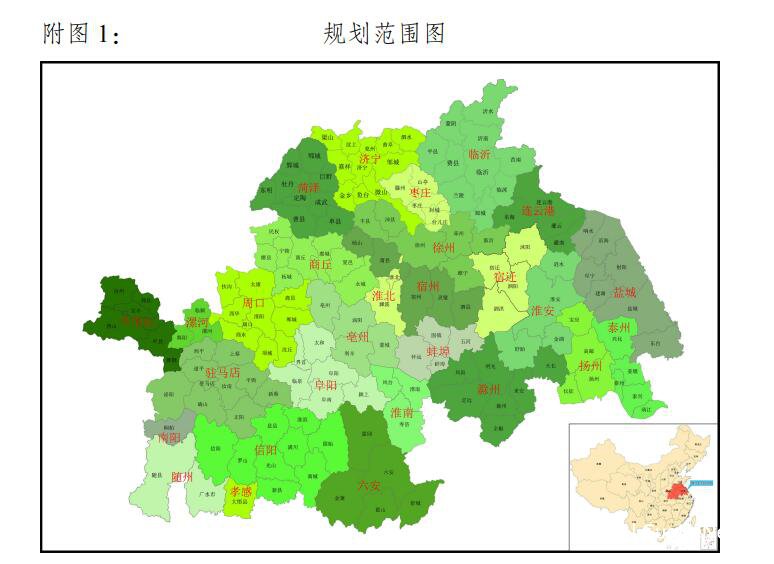淮河生态经济带以淮河干流、一级支流以及下游沂沭泗水系流经的地区为规划范围,包括江苏省淮安市、盐城市、宿迁市、徐州市、连云港市、扬州市、泰州市,山东省枣庄市、济宁市、临沂市、菏泽市,安徽省蚌埠市、淮南市、阜阳市、六安市、亳州市、宿州市、淮北市、滁州市,河南省信阳市、驻马店市、周口市、漯河市、商丘市、平顶山市和南阳市桐柏县,湖北省随州市随县、广水市和孝感市大悟县,规划面积24.3万平方公里,2017年末常住人口1.46亿,地区生产总值6.75万亿元。
