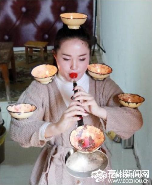王丽丽是涡阳县马店集镇一名90后女孩。自小她就非常喜欢音乐,六岁起就跟随父亲学习吹唢呐,之后自学了很多乐器,包括葫芦丝、萨克斯、钢琴等等。目前,王丽丽已经会用十余种乐器,她还传承了父亲的一门绝技,身顶六个蜡烛火碗边走边吹唢呐。