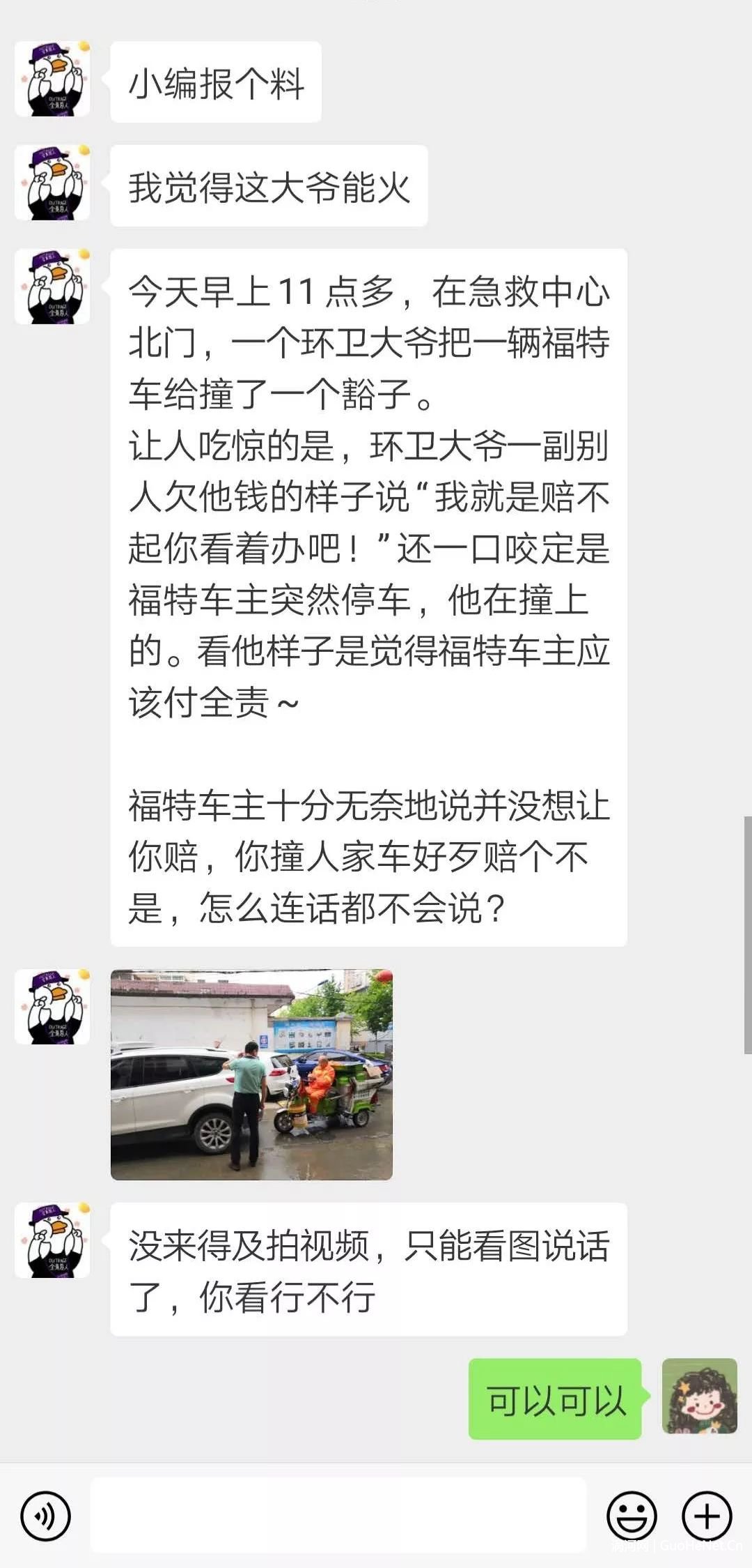今天(6月6日)早上11点多,在急救中心北门,一个环卫大爷把一辆福特车给撞了一个豁子。 让人吃惊的是,环卫大爷一副别人欠他钱的样子说“我就是赔不起你看着办吧!”还一口咬定是福特车主突然停车,他在撞上的。看他样子是觉得福特车主应该付全责~ 福特车主十分无奈地说并没想让你赔,你撞人家车好歹赔个不是,怎么连话都不会说? 等到福特车主无奈地离开,环卫大爷才没有好气的说出一句“对不起成了吧?!”