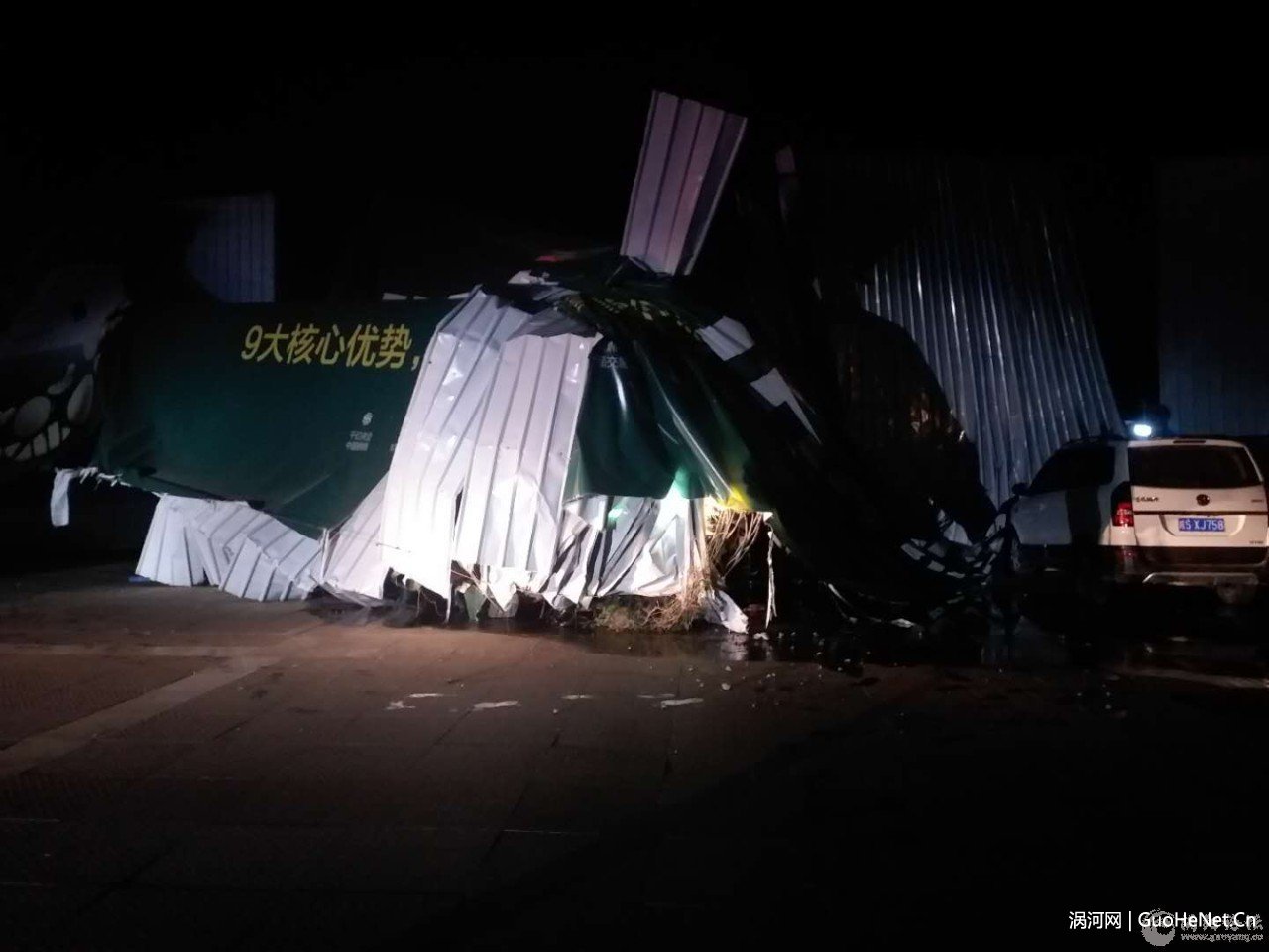 昨晚城东大货车疲劳驾驶,冲撞新农贸市场售楼部门前围栏大型广告牌。围栏被撞的严重变形将整个车都包裹在里面,造成城东大面积停电。