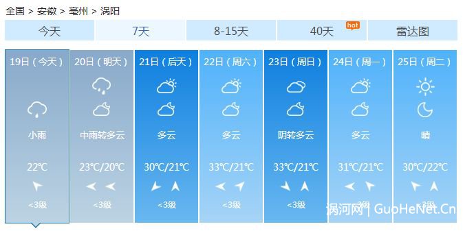 预计19日夜里到20日白天有阵雨或雷雨,雨量分布不均,部分地区可能伴有雷暴,短时强降水等强对流天气;21-25日以多云到晴天气为主,气温逐渐回升,最高气温33到35度。
