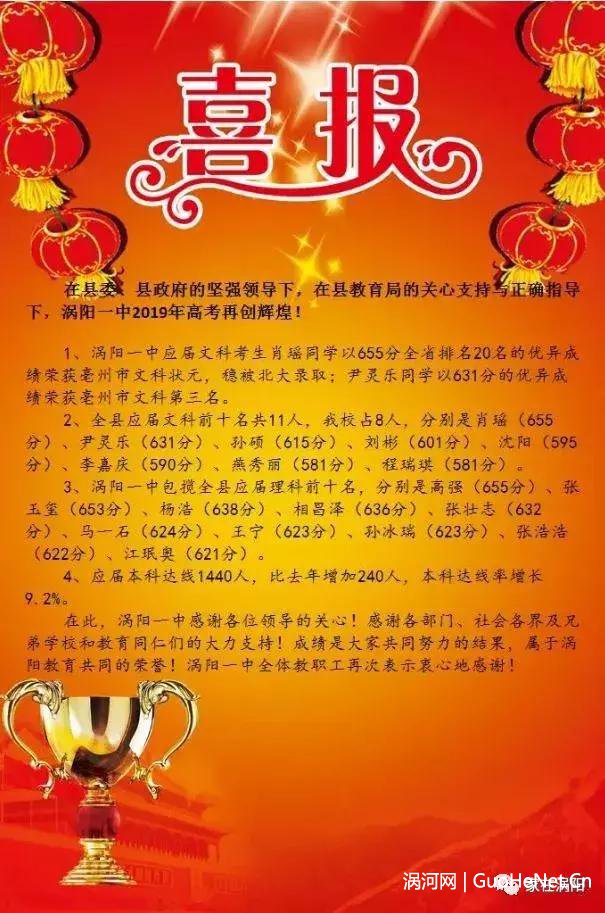 1、涡阳一中应届文科考生肖瑶同学以655分全省排名20名的优异成绩荣获亳州市文科状元,稳被北大录取;尹灵乐同学以631分的优异成绩荣获亳州市文科第三名。