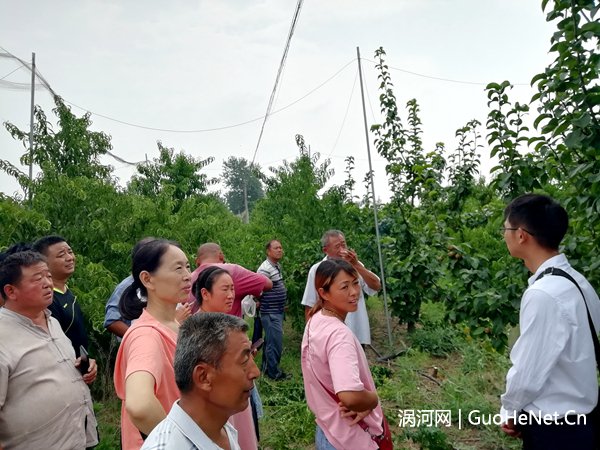 在涡阳县永发水果种植合作社优质桃种植基地,合作社技术专家给学员们现场讲授了夏季适时对桃树修剪和管理技术。