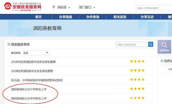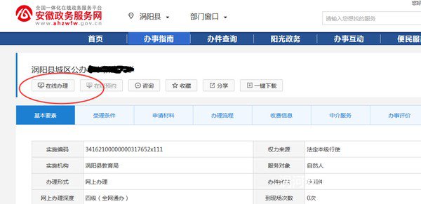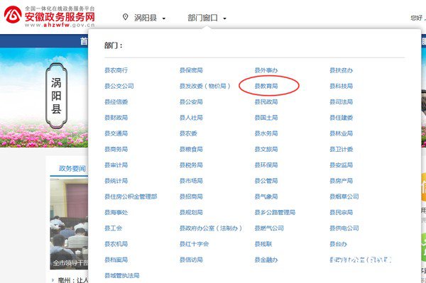 第二步:选择“安徽省政务服务网亳州分厅—涡阳县厅—部门窗口—县教育局”,选择对应的政务服务事项,点击“在线办理”。