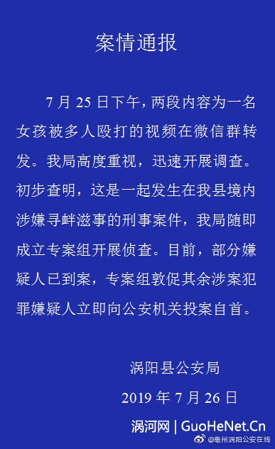 7月25日晚,两段一名女孩被多人脚踹、抽耳光,甚至被皮带和鞋底殴打的视频在微信群传播广泛,并引发关注。26日凌晨,涡阳警方发布案情通报。通报称,这是一起发生在涡阳境内涉嫌寻衅滋事的刑事案件。警方已成立专案组开展侦查。目前部分嫌疑人已到案。