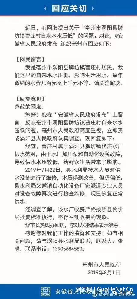 近日有网友提出关于“亳州市涡阳县牌坊镇曹庄村自来水水压低”的问题对此安徽省人民政府发布 组织亳州市回应如下: