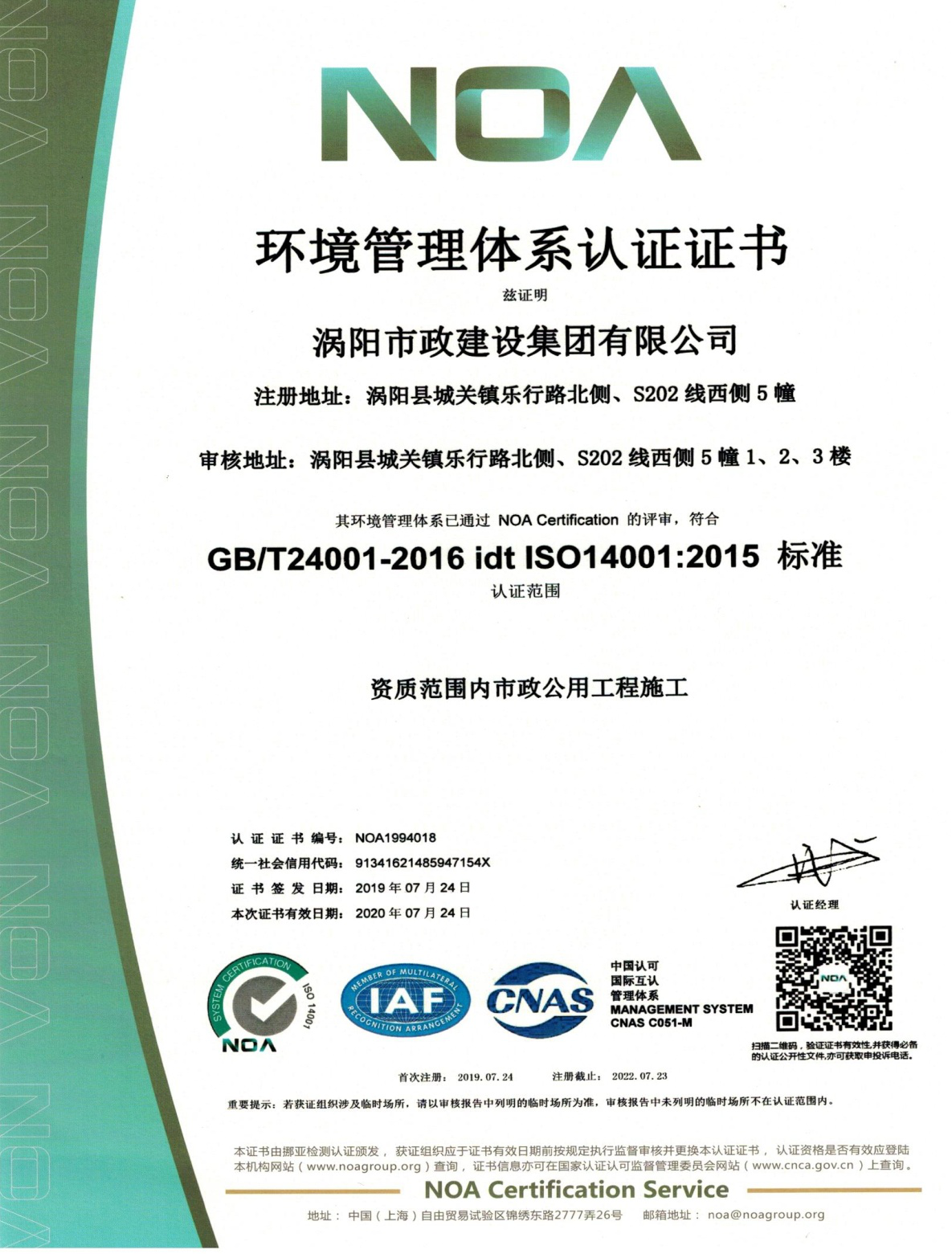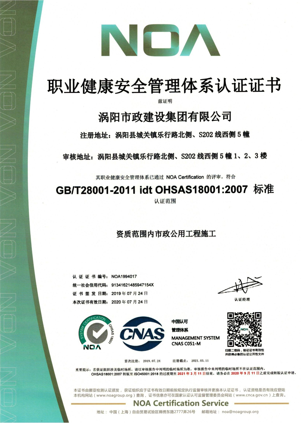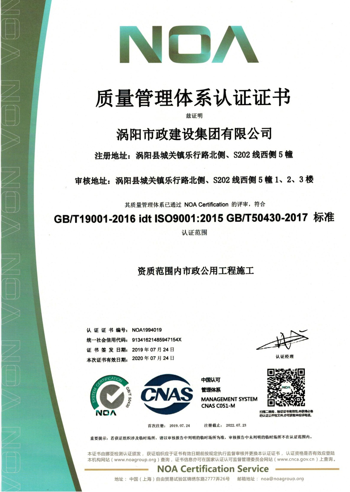 历时一个多月,上海“NOA挪亚认证”对涡阳市政建设集团ISO三体系认证已通过。