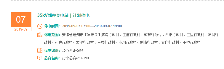 停电范围:安徽省亳州市【涡阳县】解沟行政村、王庙行政村、郭寨行政村、西阳行政村、三里行政村、葛楼行政村、瓦房行政村、太平行政村、王楼行政村、张沟行政村、刘庙行政村、文庙行政村、王桥行政村