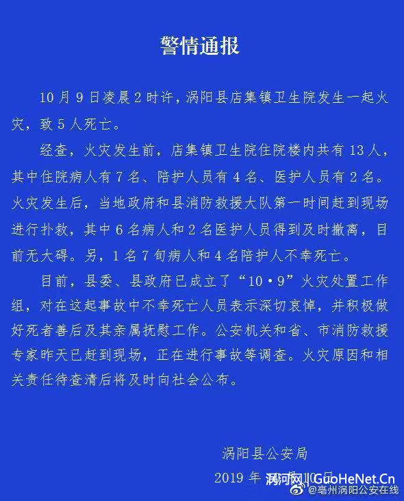 10月10日上午,涡阳县公安局发布通报称,火灾发生前,店集镇卫生院住院楼内共有13人,其中住院病人有7名、陪护人员有4名、医护人员有2名。其中6名病人和2名医护人员得到及时撤离,目前无大碍。1名七旬病人和4名陪护人员不幸死亡。目前,涡阳县公安机关和省、市消防救援专家已赶到现场,正在进行事故调查。火灾原因和相关责任待查清后将向社会公布。