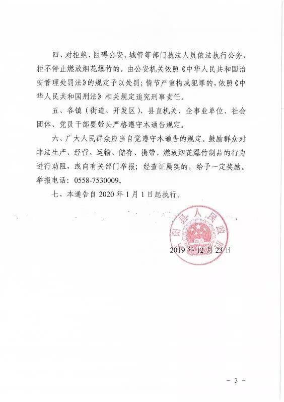 六、广大人民群众应当自觉遵守本通告的规定。鼓励群众对非法生产、经营、运输、储存、携带、燃放烟花爆竹制品的行为进行劝阻,或向有关部门举报;经查证属实的,给予一定奖励。举报电话:0558-7530009。