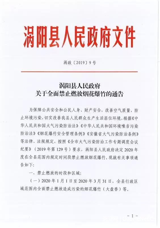 为保障公共安全和公民人身、财产安全,改善空气质量,防止环境污染,切实改善我县人民群众生产生活居住环境,根据《中华人民共和国大气污染防治法》《中华人民共和国环境噪音污染防治法》《烟花爆竹安全管理条例》《安徽省大气污染防治条例》等法律、法规规定,按照《全市大气污染防治工作专题调度会议纪要》(2019年第129号)要求,涡阳县人民政府决定2020年度在全县范围内规定时间段禁止燃放烟花爆竹。现就有关事项通告如下: