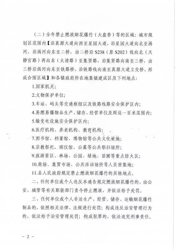 (二)全年禁止燃放烟花爆竹(大盘香)等的区域:城市规划区范围内【沿真源大道向西至星园大道,沿星园大道向北至涡河,沿涡河向东至二桥,由二桥沿S238(原S202)线向北(天静宫路)再向东(太清路)至集贤路,沿集贤路向南至三桥,由三桥沿涡河向东至铁路桥,沿铁路线向南至真源大道立交桥,形成合围区域】和各镇政府所在地集镇建成区及下列地点: