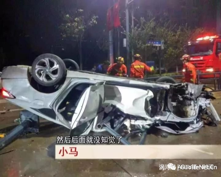 10月12号凌晨三点多,小张驾驶一辆白色小轿车,带着小马行驶到一个马路交叉口时,突然撞上了路中间的护栏,当时汽车翻了180度,倒扣在地上。