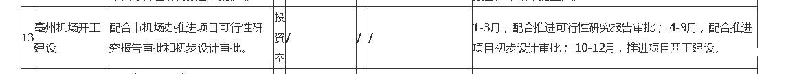 亳州机场1-3月,配合推进可行性研究报告审批;4-9月,配合推进项目初步设计审批;10-12月,推进项目开工建设。