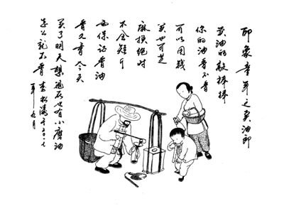 卖油郎从不吆喝,他的道具是一只油梆子。找一块上好的厚实木材,中间掏空,再装上一个木柄,油梆子就做好了。以木槌敲击,当当作响。关于这一场景,还想起一首儿歌:“油梆当当响,来了卖油郎,芝麻节节高,我家油最香。”