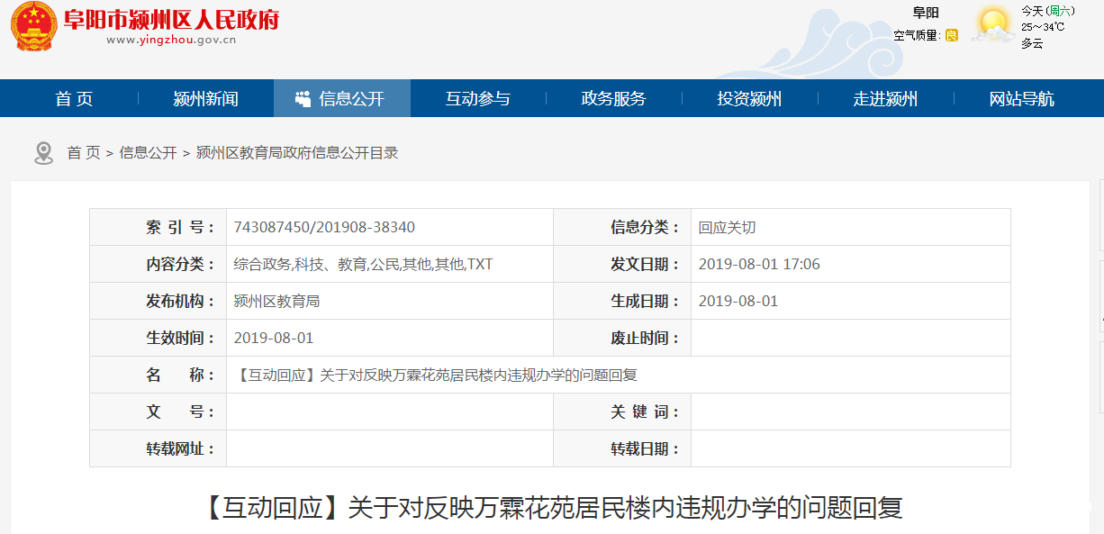 近日,有网友反映万霖花苑居民楼内违规办学。对此,颍州区教育局对此事进行回应。