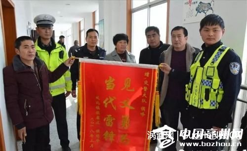 3月26日上午,利辛县城北镇侯寨村村民侯明华把一面锦旗送到利辛交警大队,感谢该队辅警侯峰不惧危险把他的孩子从河中救起。