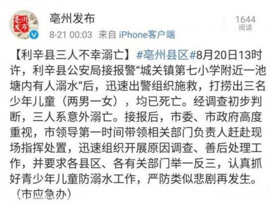 据亳州市互联网信息办公室微博消息,8月20日13时许,利辛县公安局接报警“城关镇第七小学附近一池塘内有人溺水”后,迅速出警组织施救,打捞出三名少年儿童(两男一女),均已死亡。经调查初步判断,三人系意外溺亡。