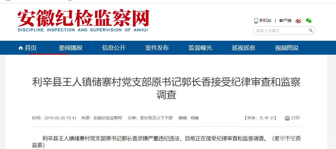 ![]() 利辛县王人镇储寨村党支部原书记郭长香涉嫌严重违纪违法,目前正在接受纪律审查和监察调查。 |