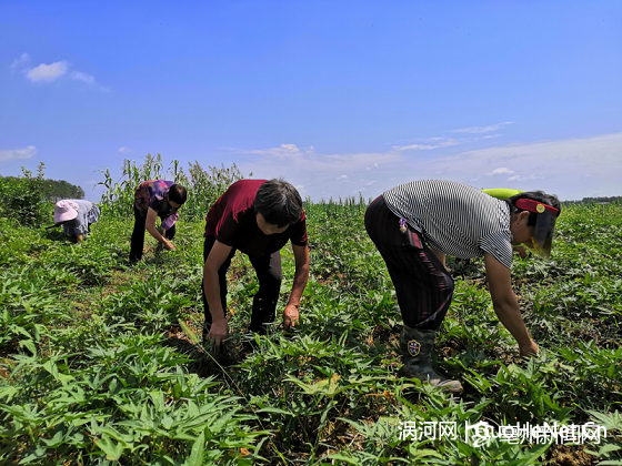 贫苦户正在水产养殖基地岸边套种的红薯田里除草