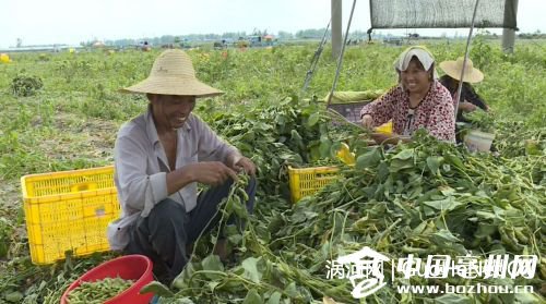 7月22日,在蒙城县小辛集乡禾丰蔬菜种植专业合作社毛豆种植基地里,上百名留守妇女和贫困户支起大伞正忙着采摘毛豆。