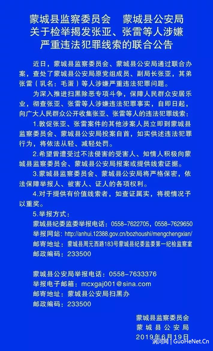 近日,蒙城县监察委员会、蒙城县公安局通过联合办案,查处了蒙城县公安局原党组成员、副局长张亚,其弟张雷(乳名:毛蛋)等人涉嫌严重违法犯罪问题。