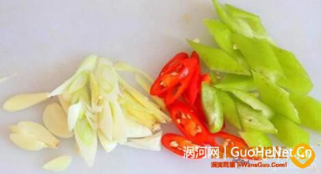 3、接着将姜、葱、蒜、尖椒和红辣椒等切小块备用;