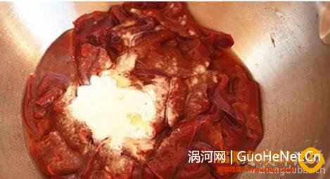 2、接着将猪肝放进盆里,加入适量的料酒和淀粉,抓匀,腌制20分钟左右;