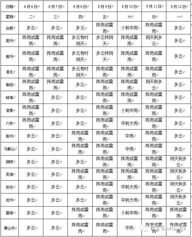 预计8号前,安徽以多云天气为主,午后到夜间局地对流性天气多发。10号前后,有望迎来一场台风雨,届时受台风“利奇马”外围云系影响,全省有一次降雨天气过程,同时全省平均风力增大至3~4级,阵风7级。