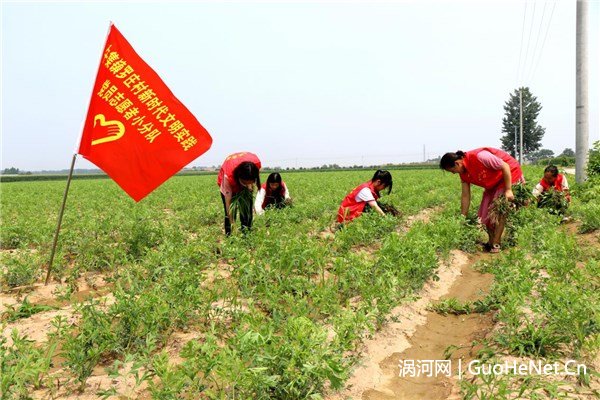 6月25日,牛集镇罗庄村党总支组织新时代文明实践党员志愿者小分队,走进建档立卡贫困户中药材大田,冒着高温,进行薅草田管作业,确保增产丰收,携手帮扶奔富路。