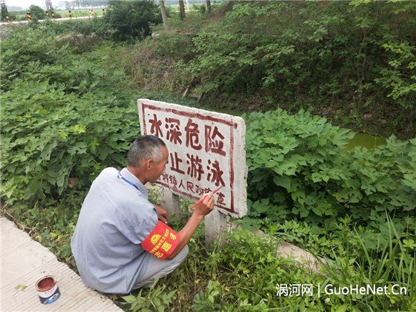 7月2日上午,烈日当头,古城镇尹楼村73岁的贫困户李思海臂带红袖章,在村里的沟塘边正不停地巡视着,并对警示标志不清楚的及时刷新。