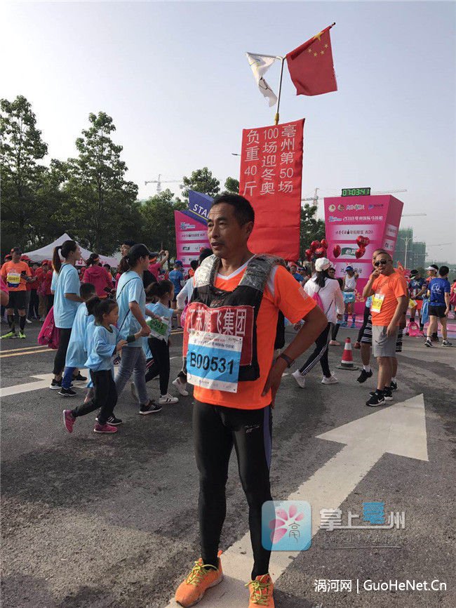 早上7点,在亳州马拉松比赛现场,选手们已经开始热身。选手陈进来自江苏南通,今天他将负重40斤跑完马拉松全程。