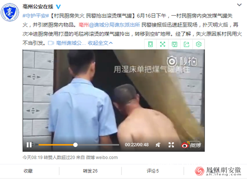 据“亳州公安在线”消息,6月16日下午,一村民厨房内突发煤气罐失火,并引燃厨房内物品。亳州谯城分局谯东派出所民警接报后迅速赶至现场,扑灭明火后,再次冲进厨房使用打湿的毛毯将滚烫的煤气罐拎出,转移到空旷地带。