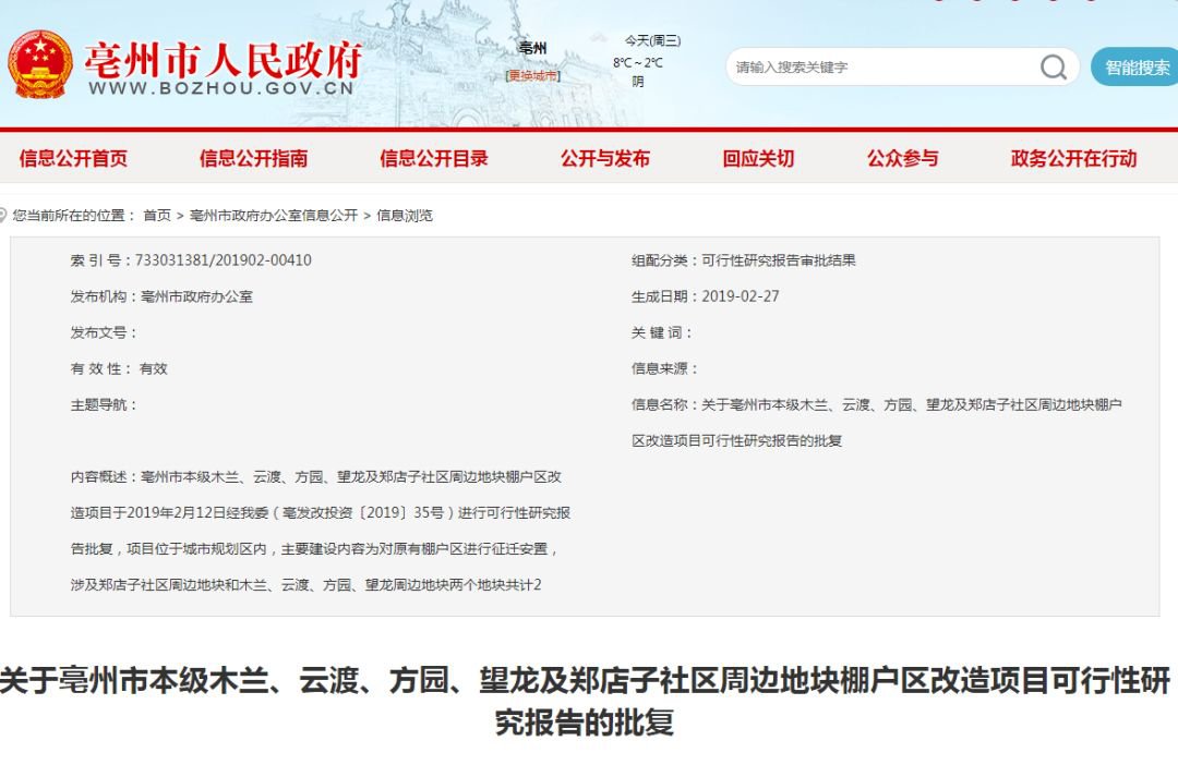 2月27日,亳州市政府网发布《关于亳州市本级木兰、云渡、方园、望龙及郑店子社区周边地块棚户区改造项目可行性研究报告的批复》。