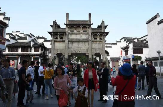 5月1日,阳光灿烂,来自江浙沪等地的众多游客来到古徽州府所在地徽州古城景区参观游览、了解徽州文化。记者潘成摄