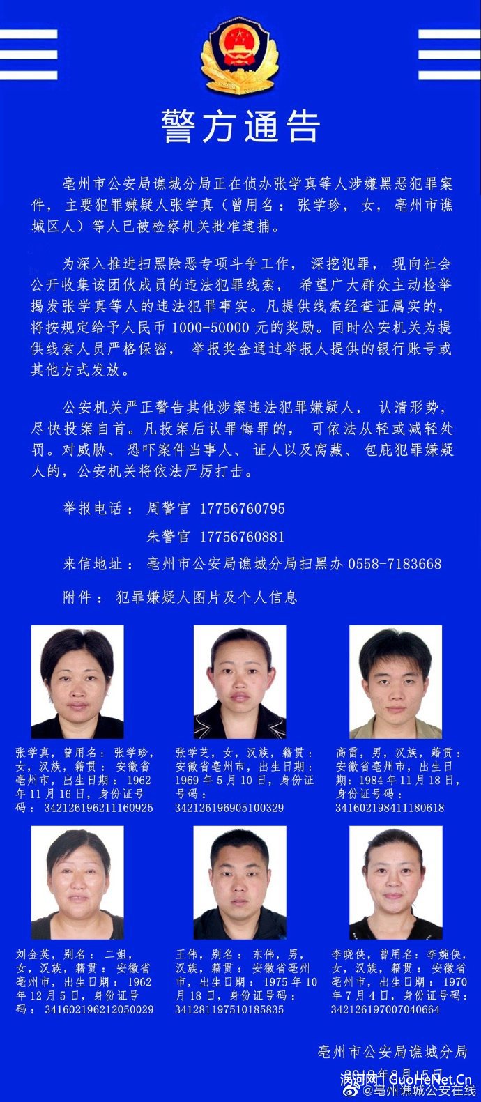 亳州警方公开收集张学真等人涉黑恶违法犯罪线索。