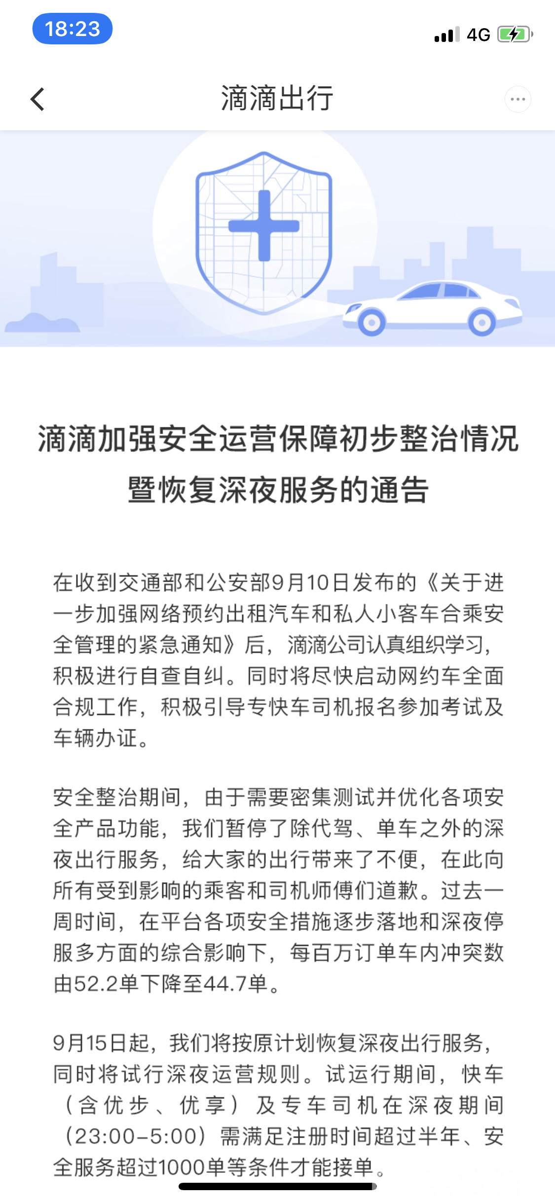 经过一个星期的暂停深夜服务后,滴滴宣布,从15号起,将恢复深夜出行服务。同时将试行深夜运营规则,即试运行期间,快车及专车司机在深夜期间(23:00-5:00)需满足注册时间超过半年、安全服务超过1000单等条件才能接单。此外,乘客端上线了全程录音、紧急联系人,司机端还上线了安全审核、人脸识别,多种整改措施过后,滴滴能否保证乘客安全到家?