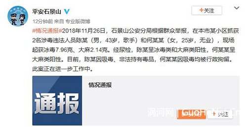 11月28日,有网曝消息称歌手羽凡因吸毒被抓。稍晚时候,“平安石景山”官博速报在11月26日,有43岁男性歌手同25岁的女性何某一同因吸毒被拘留。“平安北京”转发该微博并用羽·泉经典歌名配文:“毒品,让‘最美’凋零”。无论从“43岁男歌手”身份还是配文羽凡所在的羽·泉组合歌名,证实被抓歌手就是羽凡。