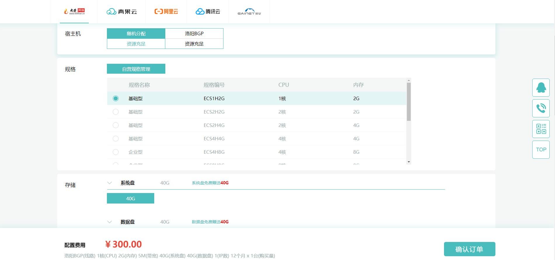 | 2G | 1核 | 40G | 5M | 300元/年 | 连接 |