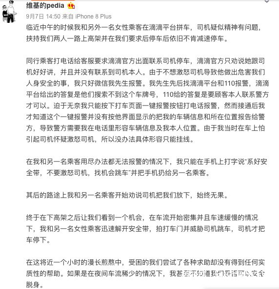 9月7日,微博网友@维基的pedia 发帖称,当日中午,她和另一名女性乘客在滴滴平台拼车,司机疑精神有问题,挟持她们一路上高架,她们要求停车,司机未减速停车。