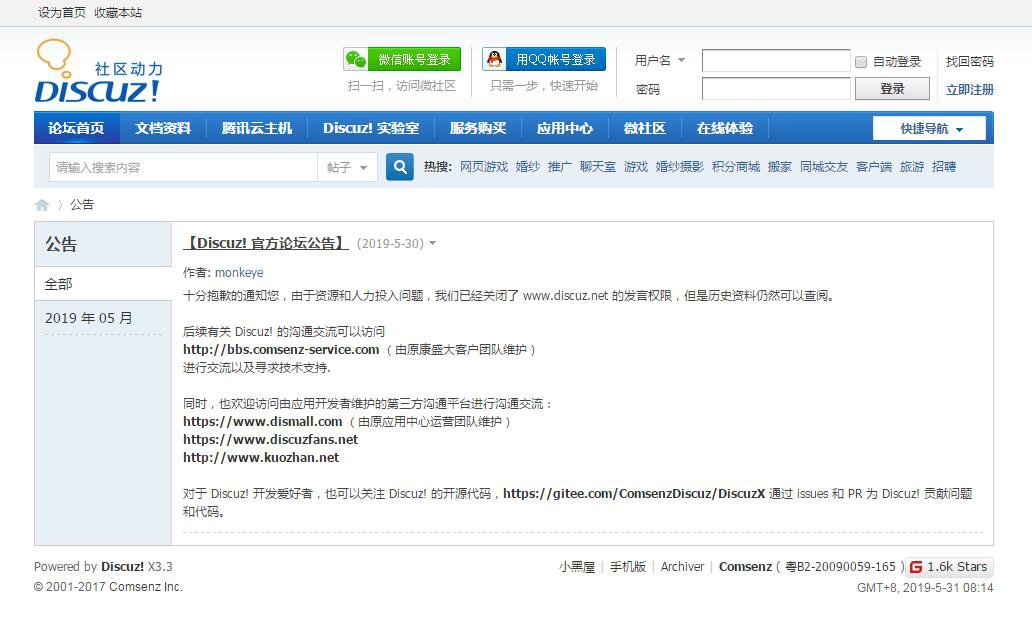 5月30日,Discuz!发布公告称,由于资源和人力投入问题,Discuz!已经关闭了 www.discuz.net 的发言权限,但是历史资料仍然可以查阅。