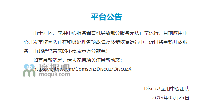 而discuz应用中心5月24号发布公告以来至5月31日仍未恢复,我们将持续关注discuz应用中心最新恢复进展。