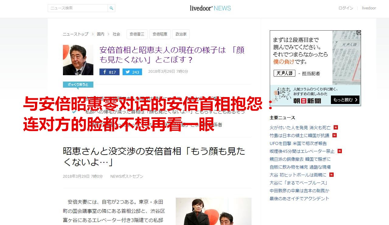 日本Livedoor网站转载《周刊邮报》杂志 日本《周刊邮报》杂志3月29日报道称,由2017年“森友学园”丑闻曝光以来,日本首相安倍晋三夫妇的关系可谓直线下滑,更在近日面临离婚危机。安倍夫妇有两处住宅,一栋是位于东京永田町国会议事堂附近的首相官邸,另一栋则是位于东京涩谷带直升电梯的3层豪华私宅。 报道称,现年已63岁的安倍晋三自2018年2月中旬起,回涩谷私宅的次数是明显减少,相反一直居住在首相官邸。同时据透露,安倍还曾对身边随从抱怨过,说“完全不想再看到安倍昭惠的脸”。 安倍昭惠则相反只住在涩谷的私宅中,而安倍的母亲则是一直随安倍夫妇同住。89岁的安倍洋子一直住在私宅的3楼,而夫妇两人住在2楼,不过看情况夫妻2人最近怕是再也不没有同住过。 据知情人透露,最近只要安倍一回涩谷私宅,安倍昭惠便会离开私宅。但安倍一旦回首相官邸,安倍昭惠便会立刻在私宅出现。夫妻2人完全当面零交流,甚至连电话联系也没有,是谁故意避开还是其中有内幕,恐怕也只有当事人心里才最清楚。