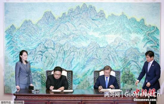 ![]() 当地时间4月27日下午,韩朝领导人在经过一天会谈后签署协议,共同签署《板门店宣言》,并在和平之家外举行发布会。图为签署仪式现场。